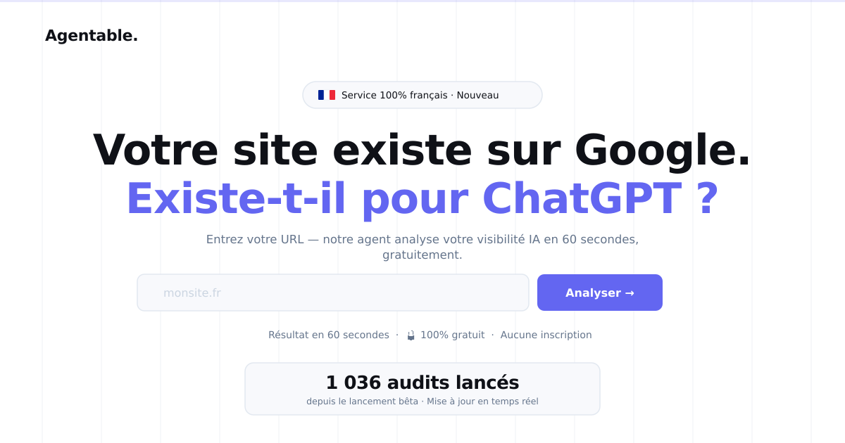 Le GEO (Generative Engine Optimization) est le nouveau SEO : il s'agit d'optimiser sa présence dans les réponses des IA comme ChatGPT, Perplexity ou Gemini. Agentable automatise l'audit GEO pour les PME françaises — analyse de visibilité IA, recommandations actionnables, rapport détaillé — en quelques minutes.